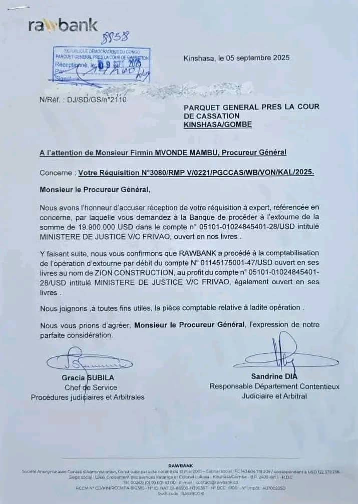 La transaction a été confirmée dans une correspondance officielle de RAWBANK datée du 5 septembre 2025, adressée au Procureur Général, Firmin Mvonde Mambu.