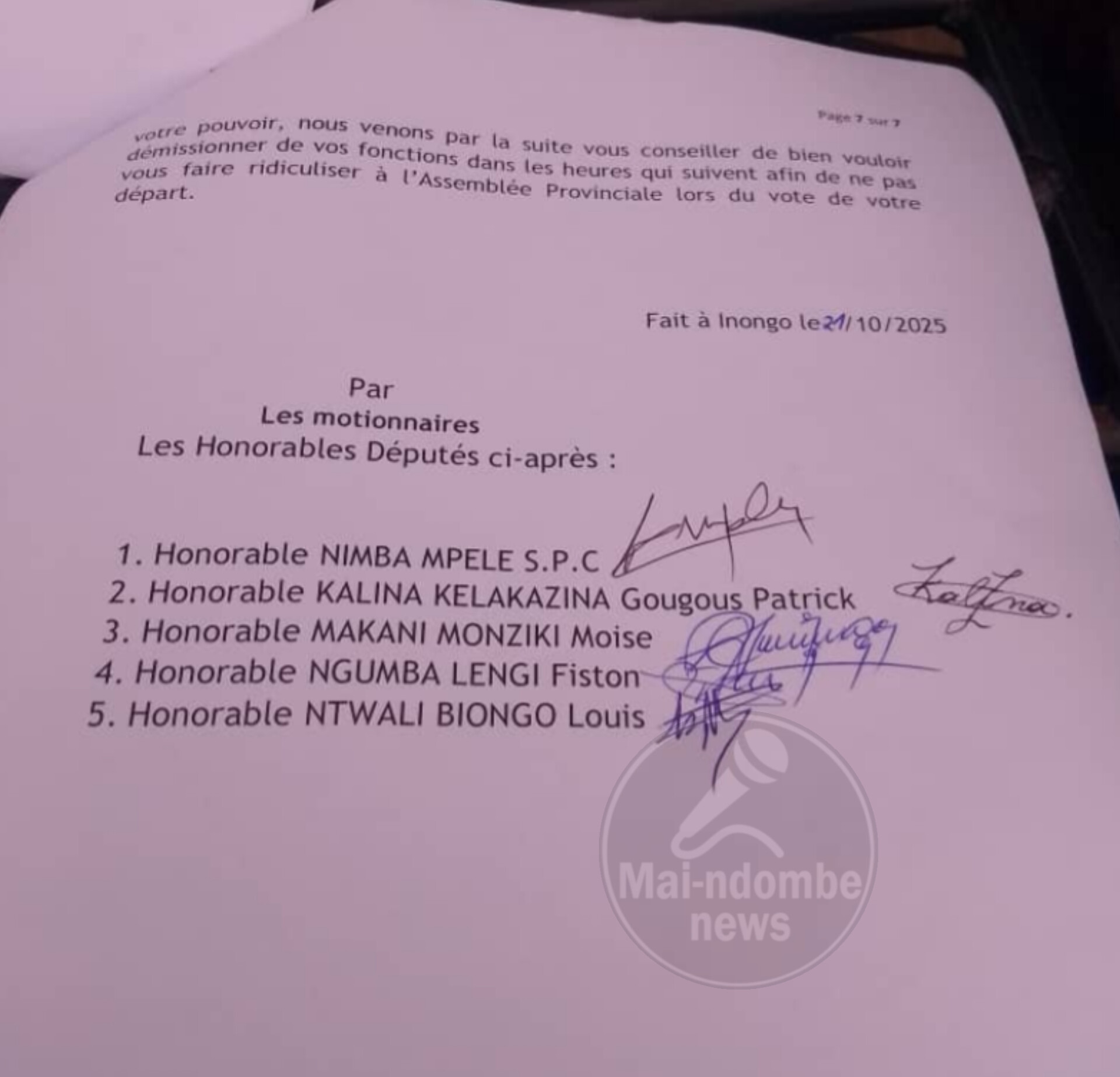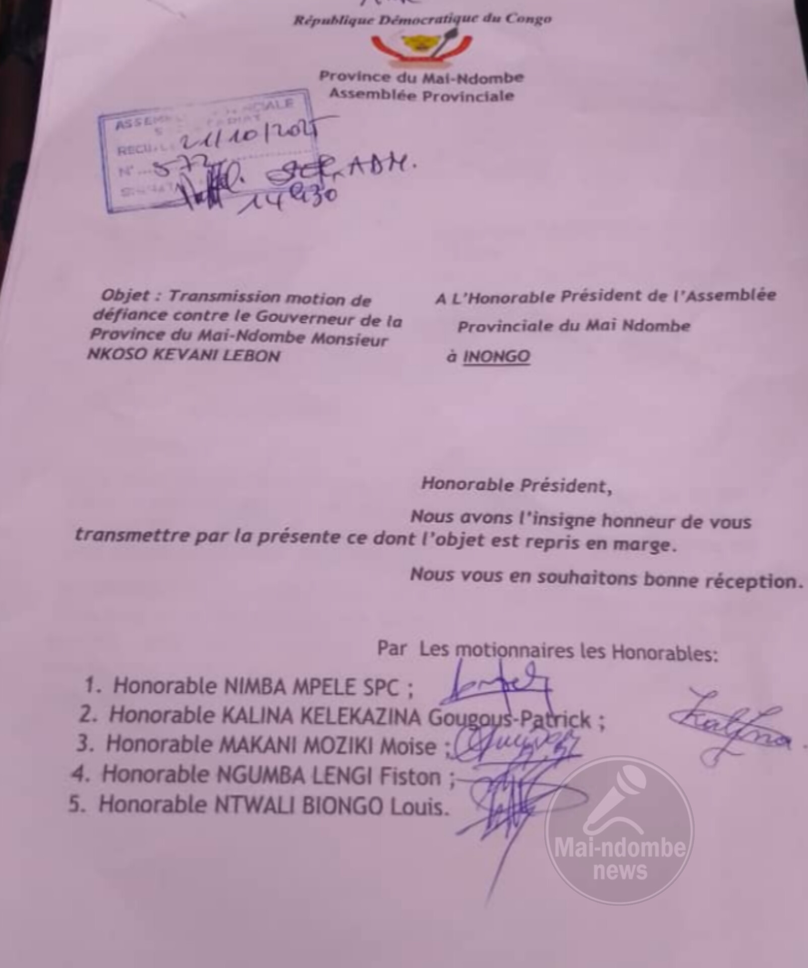 Un groupe de cinq députés provinciaux de Mai-Ndombe ont introduit, le mardi 21 octobre 2025, une motion de défiance contre le gouverneur Nkoso Kevani Lebon à l’Assemblée provinciale.