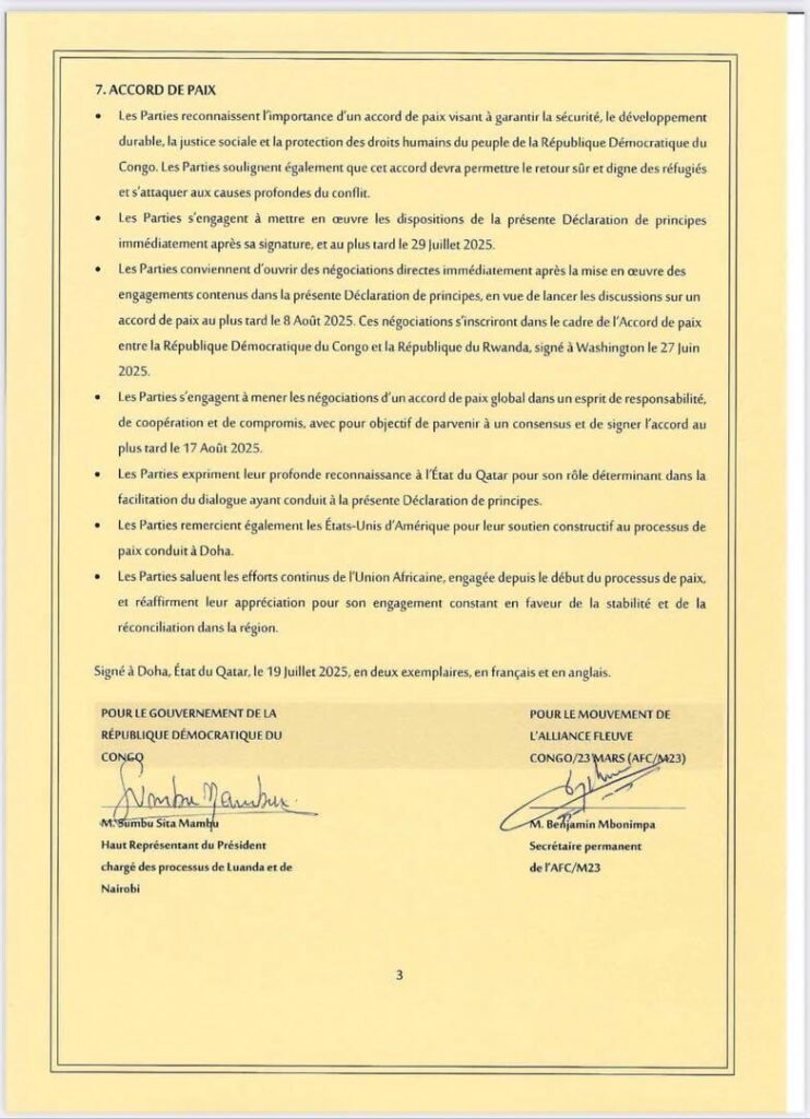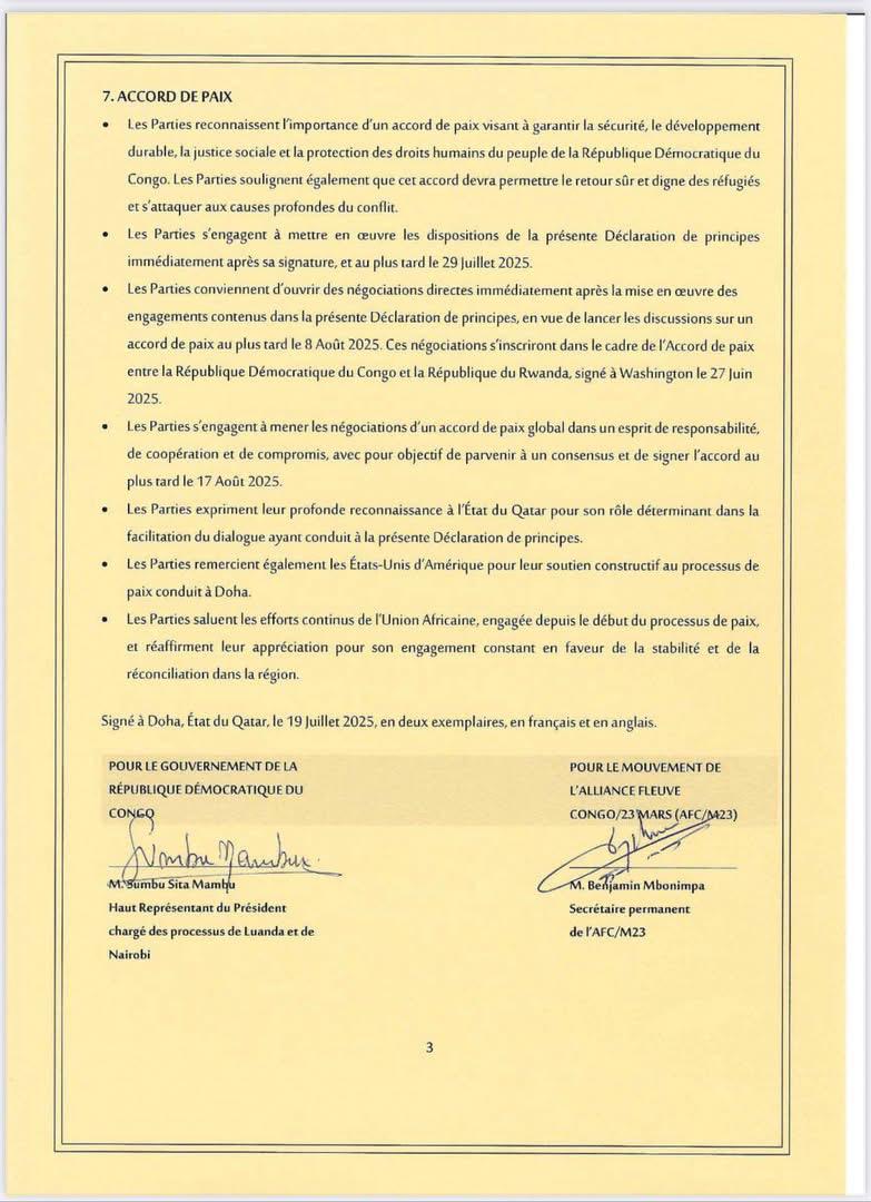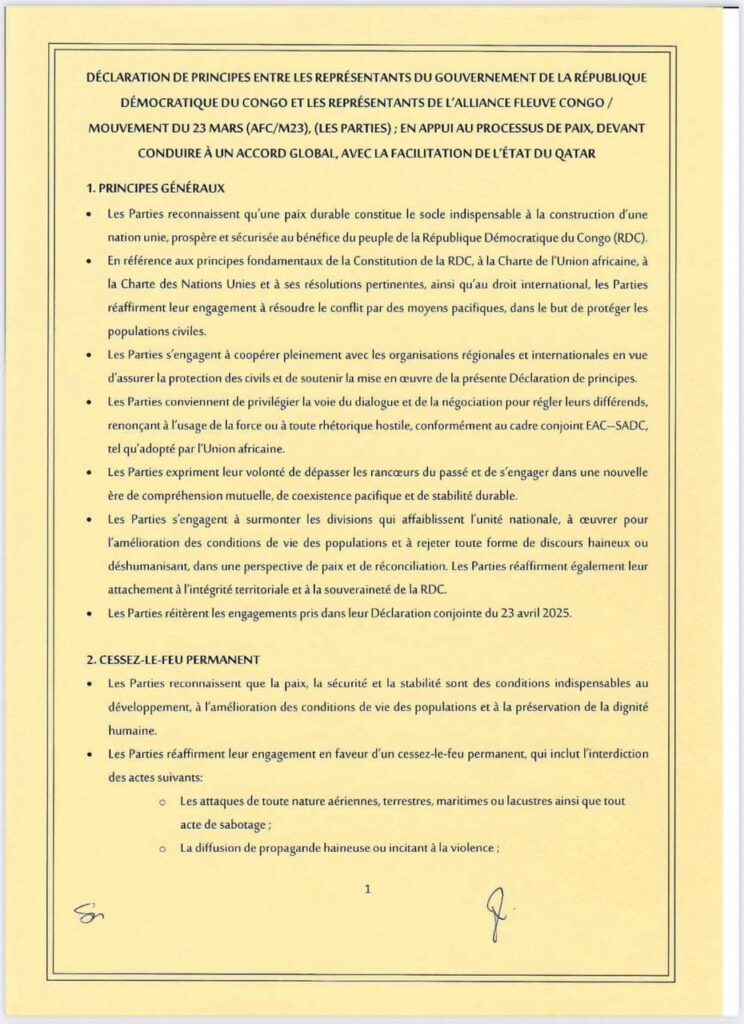 Le gouvernement congolais et le groupe rebelle M23/AFC ont signé un accord de principes le samedi 19 juillet à Doha, après trois mois des discussions intenses sous la médiation du Qatar.