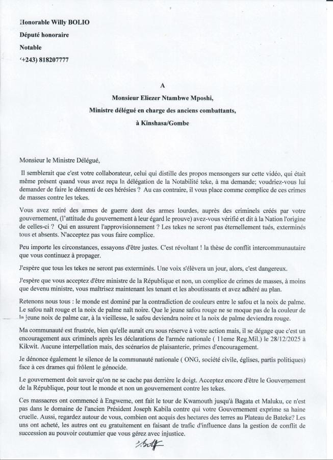 Dans une correspondance datée du 22 février 2026, et consultée par la rédaction de Maï-Ndombenews.net ce 24 fevrier adressée au ministre délégué en charge des anciens combattants, Eliezer Ntambwe Mposhi, Willy Bolio, député national honoraire, interpelle ouvertement le gouvernement sur la gestion des violences opposant les communautés Teke et Yaka.