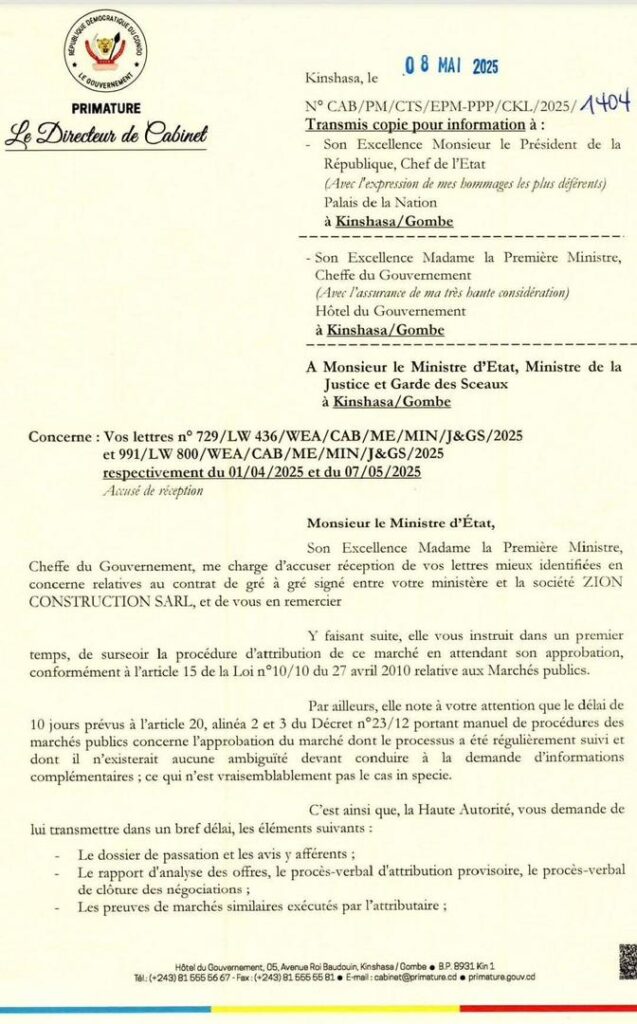 Dans une correspondance datée du 08 mai dernier, signée par son cabinet et consulté ce jeudi par la rédaction de Maï-Ndombenews.net, la Première ministre, Judith Suminwa, enjoint le Ministre de la Justice, Constant Mutumba, de suspendre le contrat de gré à gré signé entre son ministère et la société Zion Construction pour la construction de la Prison centrale de Kisangani dans la province de la Tshopo.