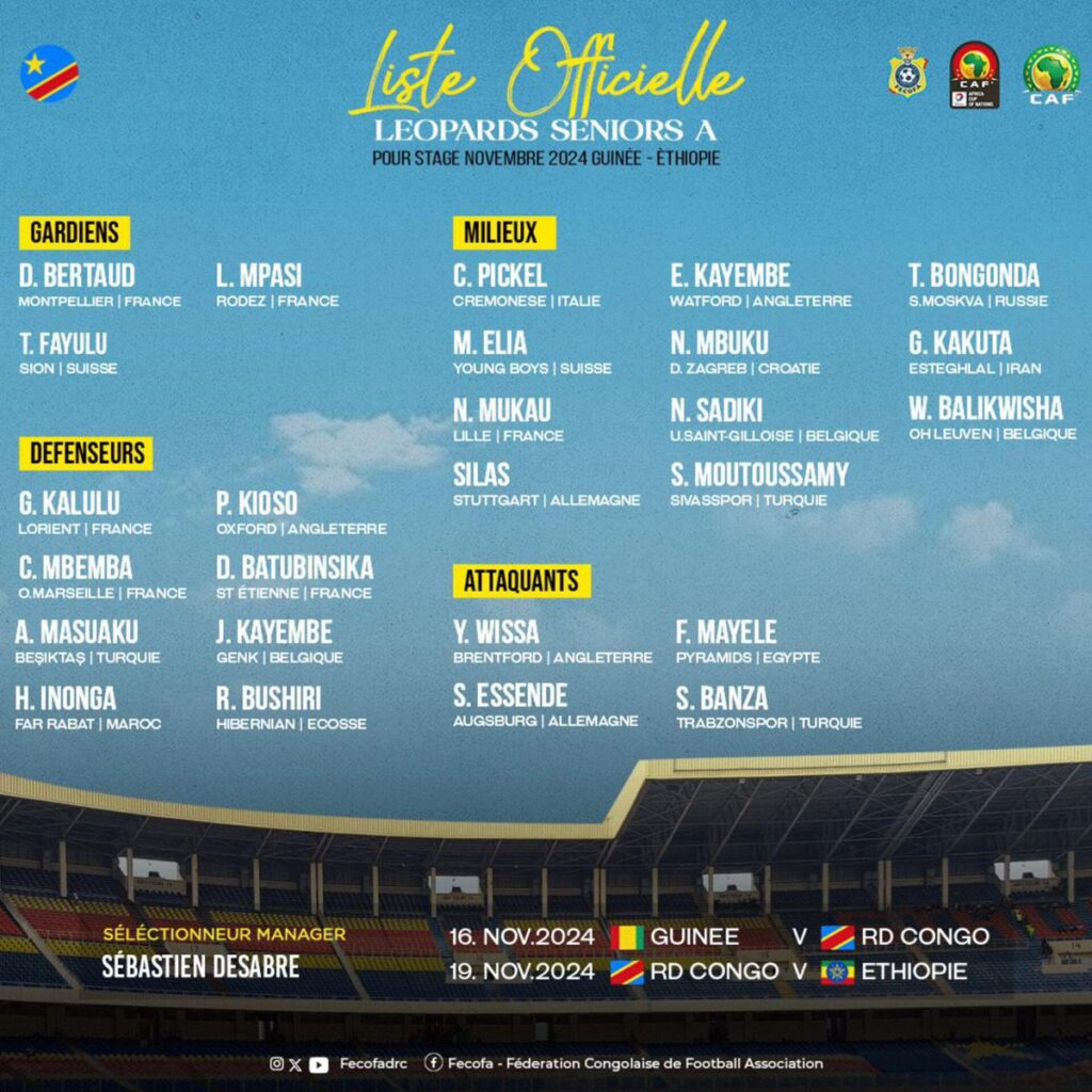 Les joeurs Yoane Wissa et Ngal’ayel Mukau sont de retour sur la liste du sélectionneur national des Léopards de la République Démocratique du Congo (RDC), Sebastien Desabre rendue public, le 3O octobre pour affronter les deux dernières journées des éliminatoires de la Coupe d’Afrique des Nations (CAN), Maroc 2025.