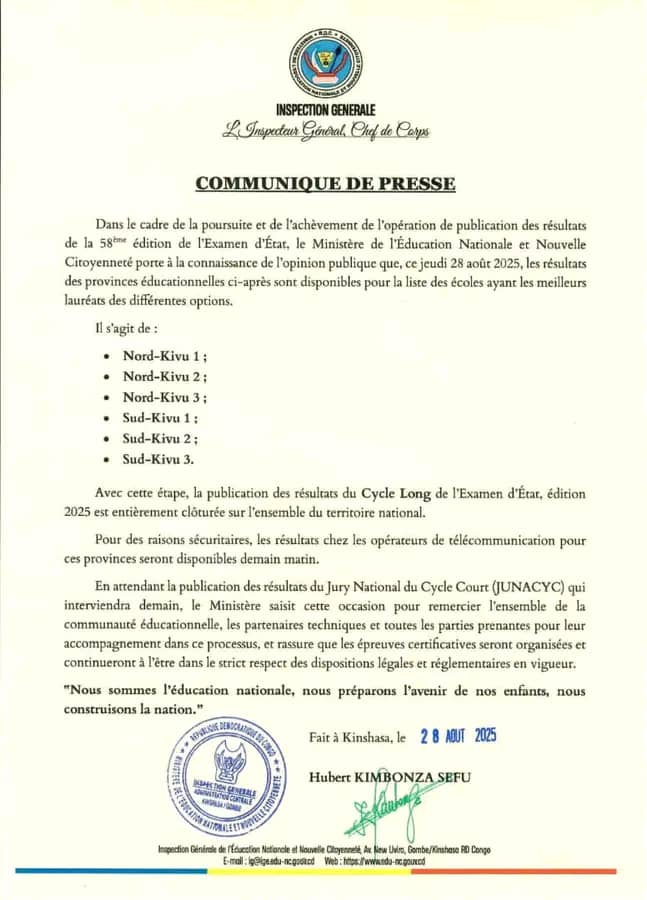 Les dernières provinces concernées sont Nord-Kivu 1, 2, 3 ainsi que Sud-Kivu 1, 2, 3. Pour des raisons sécuritaires, les résultats y seront accessibles auprès des opérateurs de télécommunication à partir de ce matin, précise un communiqué signé par l’Inspecteur général, chef de corps, Hubert Kimbonza Sefu.