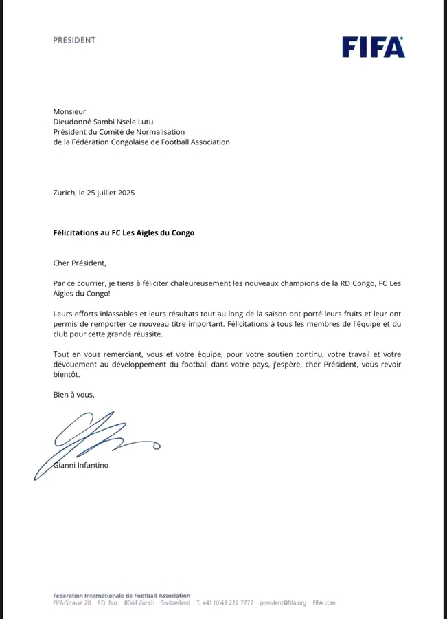 Le Football Club Les Aigles du Congo a reçu les félicitations officielles de la Fédération Internationale du Football Association (FIFA) pour son sacre en championnat national de la RDC. Une reconnaissance internationale rendu public le vendredi 25 juillet dernier, qui consacre un parcours impressionnant pour ce club kinois, champion de la République Démocratique du Congo pour la première fois de son histoire, seulement deux ans après sa création.