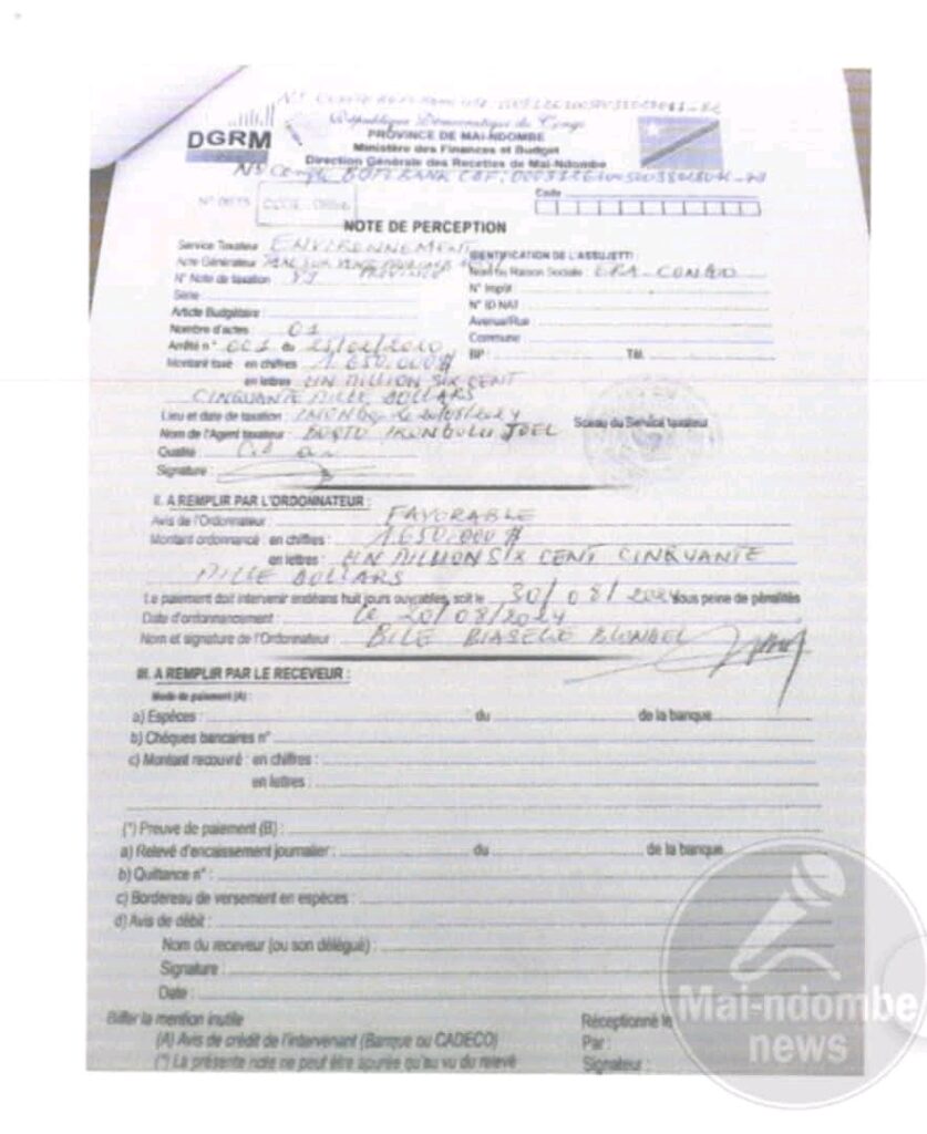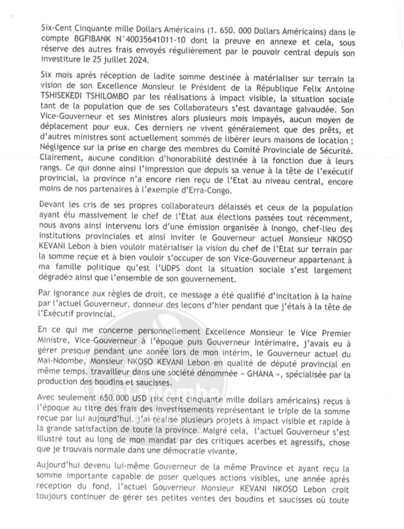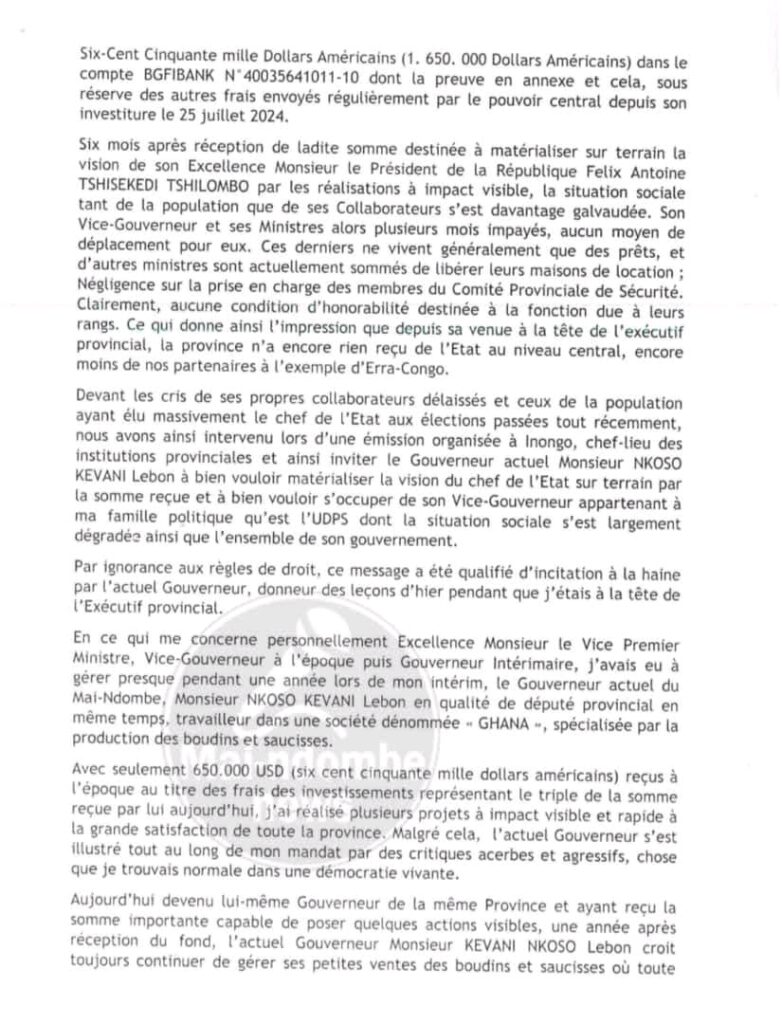 Dans ce document, il évoque principalement une somme d’un million six-cents cinquante milles dollars américains ( 1 650 000 USD ) destinés au Mai-Ndombe par la société Era-Congo en août 2024.