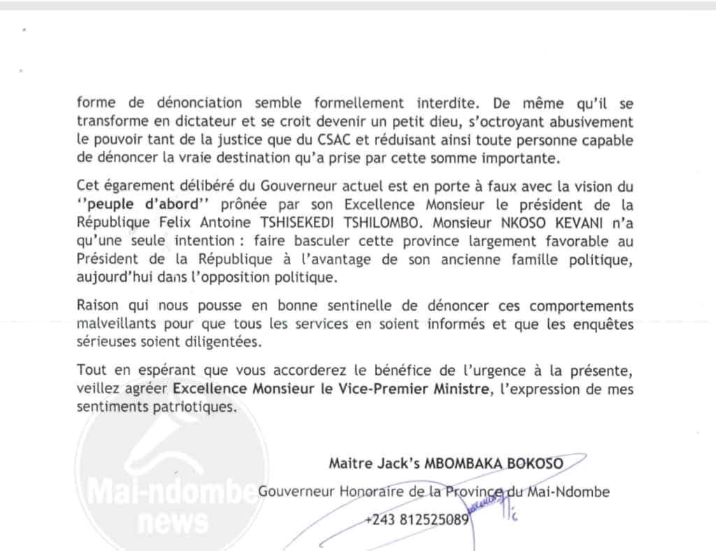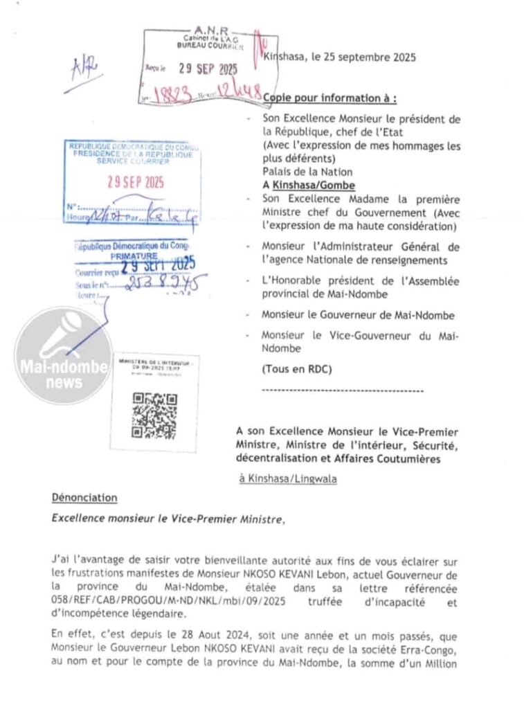 «C’est depuis le 28 août 2024, soit une année et un mois passés , que Monsieur le Gouverneur Lebon Nkoso Kevani avait reçu de la société Era-Congo au nom et pour le compte de la province du Mai-Ndombe, la somme d’un million six-cents cinquante milles dollars américains dans le compte BGFIBANK N°40035641011-10…sous réserve des frais envoyés régulièrement par le pouvoir central depuis son investiture le 25 juillet 2024. …Après la réception de cette somme, destinée à matérialiser sur terrain la vision de son Excellence Monsieur le Président de la République, Félix Antoine Tshisekedi Tshilombo par les réalisations à impact visible, la situation sociale tant de la population que de ses collaborateurs s’est davantage galvaudée. Son vice-gouverneur et ses ministres sont alors impayés.», a dénoncé Jack’s Mbombaka.