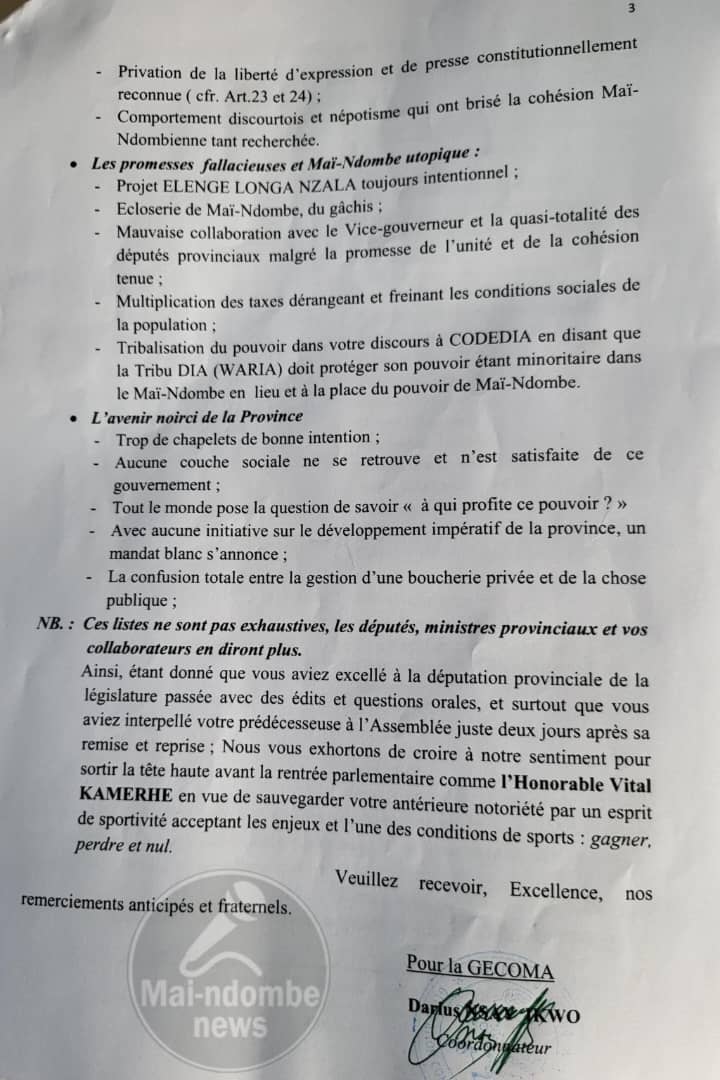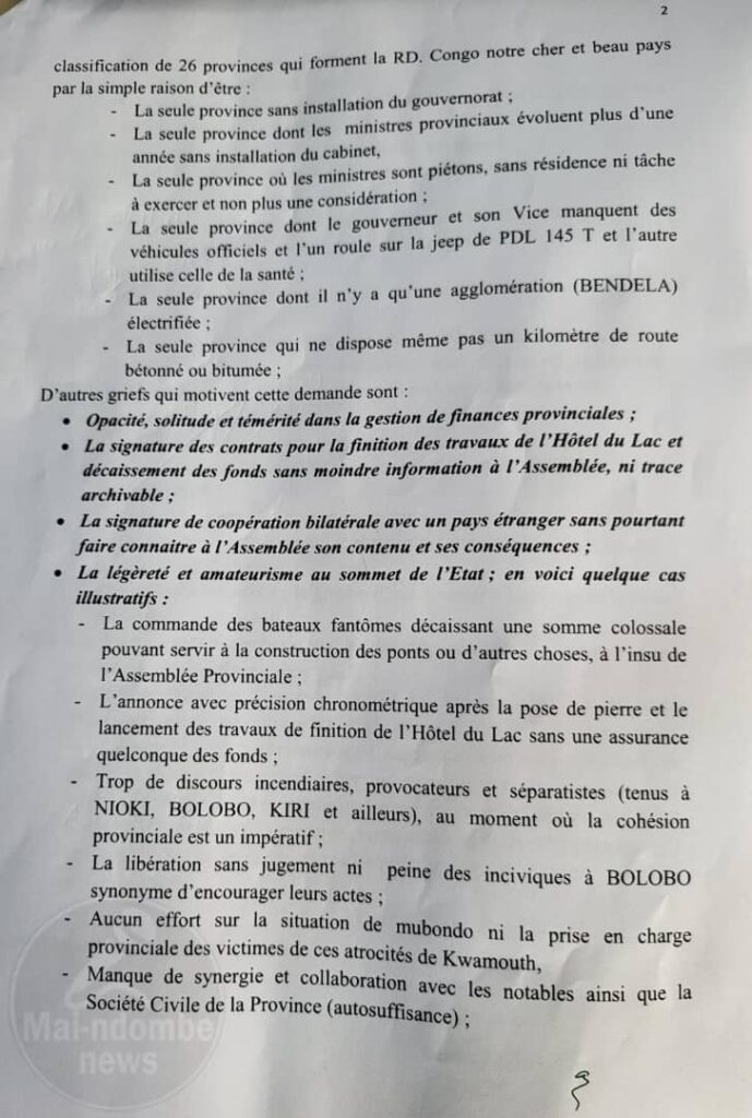 Selon ce document, la province de Mai-Ndombe aurait perdu sa place dans la scène nationale, et les attentes de la population ne seraient plus rencontrées sous la gouvernance actuelle.