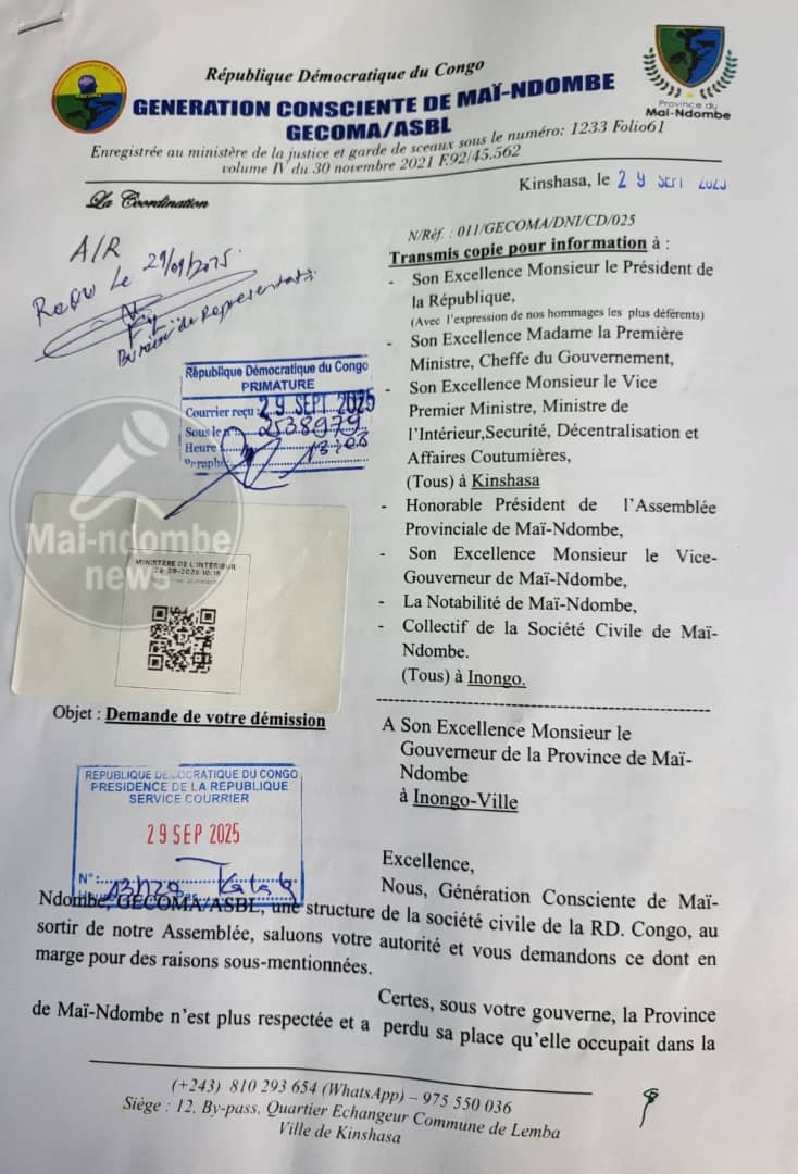 La Génération Consciente de Mai-Ndombe (GECOMA/ASBL), une structure de la société civile, a officiellement adressé une demande de démission au gouverneur de la province, Nkoso Kevani Lebon, dans un document dont une copie est parvenu à la rédaction de Mai-ndombenews.net ,ce lundi 29 Septembre.