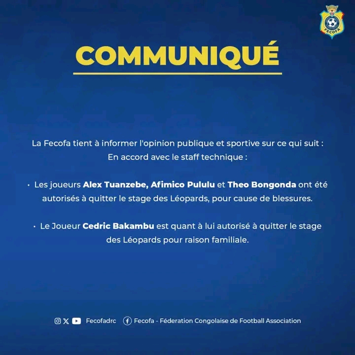 Touchés physiquement lors du regroupement, Tuanzebe, Pululu et Bongonda ont été libérés d’un commun accord avec le staff technique dirigé par Sébastien Desabre. Quant à Bakambu, l’avant-centre du Real Betis, quitte le groupe pour raisons familiales.