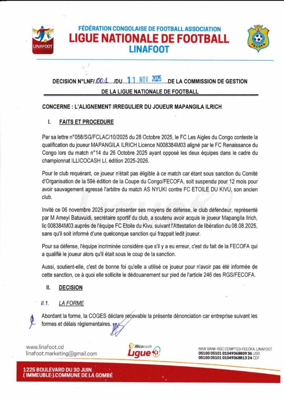 Saisi par une plainte officielle datée du 28 octobre, les champions en titre avait contesté la qualification de Mapangila, suspendu pour douze mois après une agression sur un arbitre lors de la 59e de la Coupe du Congo. Malgré cette sanction toujours en vigueur, le joueur avait été titularisé par Renaissance.