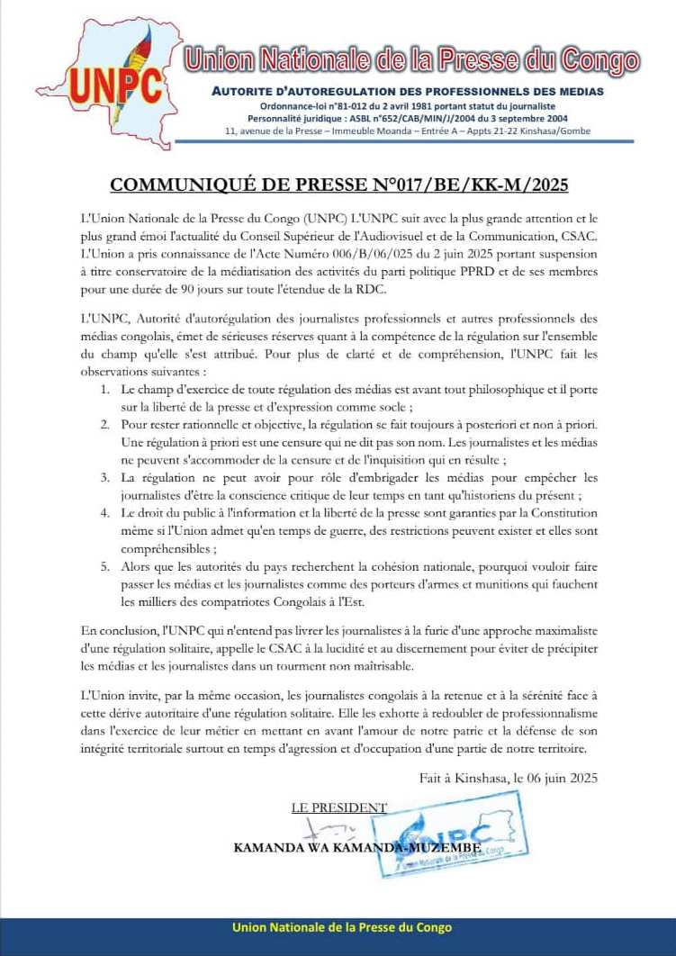 Dans un document rendu public ce vendredi 06 juin, l’Union nationale de la presse du Congo (UNPC) dit suivre avec une vive inquiétude l’évolution de l’actualité autour du Conseil supérieur de l’audiovisuel et de la communication (CSAC). Et ce, notamment sa récente décision de suspendre, à titre conservatoire, la couverture médiatique des activités du Parti du peuple pour la reconstruction et la démocratie (PPRD) et de ses membres, pour une durée de 90 jours sur toute l’étendue du territoire national.