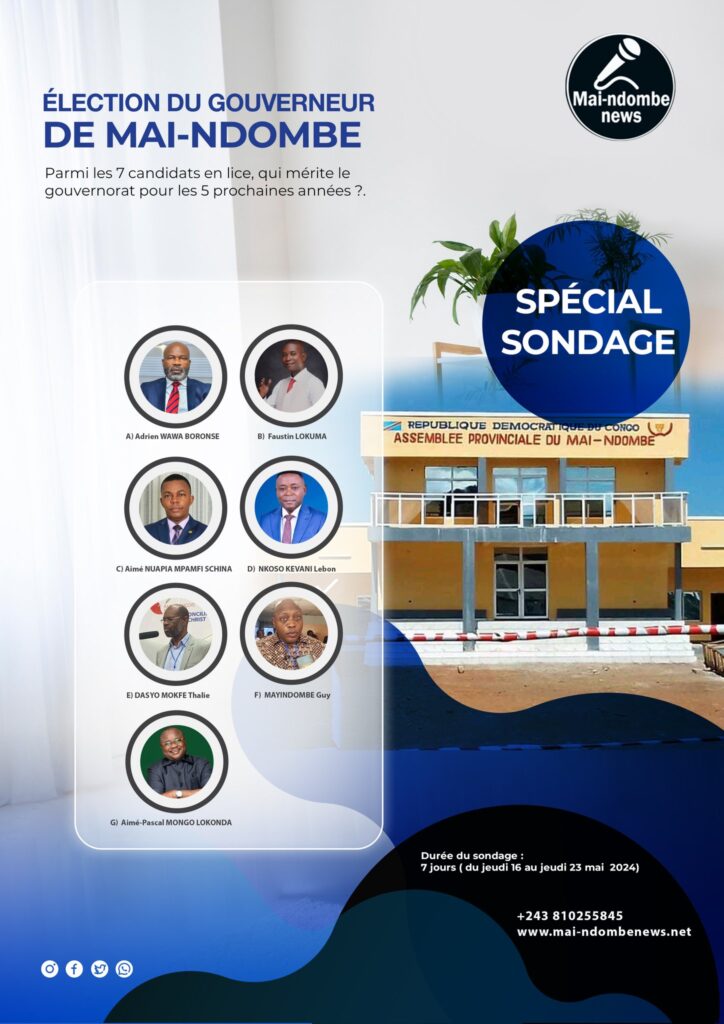 Le média en ligne Mai-ndombenews.net a lancé un sondage en rapport avec l’élection du futur Gouverneur de la province du Mai-Ndombe. Et ce, depuis le jeudi 16 mai dernier sur ses réseaux sociaux ( page Facebook et compte X).