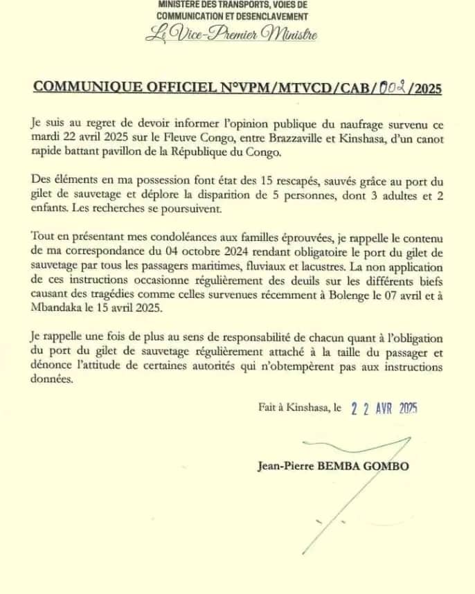 Dans un communiqué signé le même mardi, le VPM des transports, Jean-Pierre Bemba, a indiqué que ce drame a connu 15 rescapés sauvés grâce au port des gilets. Cependant, cinq personnes sont portées disparues dont deux enfants.