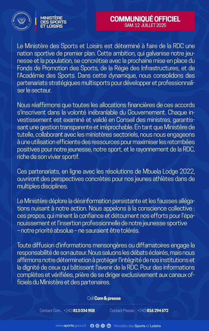 Dans un communiqué officiel rendu public ce samedi 12 juillet 2025, le ministère a rappelé que ces accords, validés en Conseil des ministres, ne sont pas des dépenses superflues, mais des investissements mûrement réfléchis, visant à renforcer la visibilité du pays dans plusieurs secteurs clés, notamment le sport, le tourisme, la diplomatie et la jeunesse.