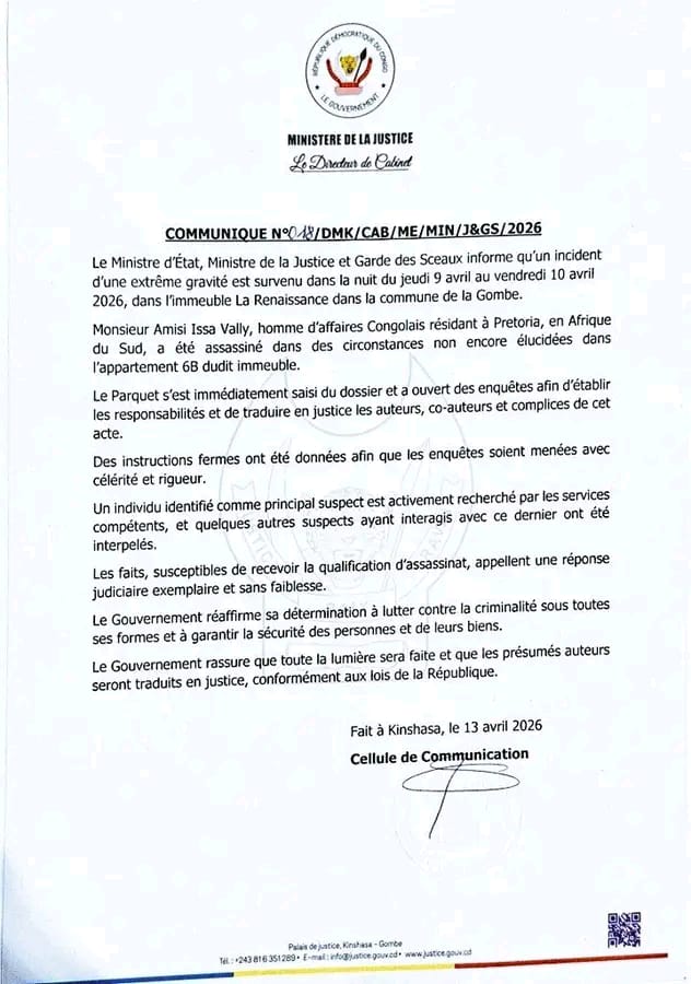 Un homme d’affaires congolais, Amissi Issa Vally, a été tué dans la nuit du jeudi 9 au vendredi 10 avril 2026 dans un appartement de l’immeuble La Renaissance, situé dans la commune de la Gombe, à Kinshasa.