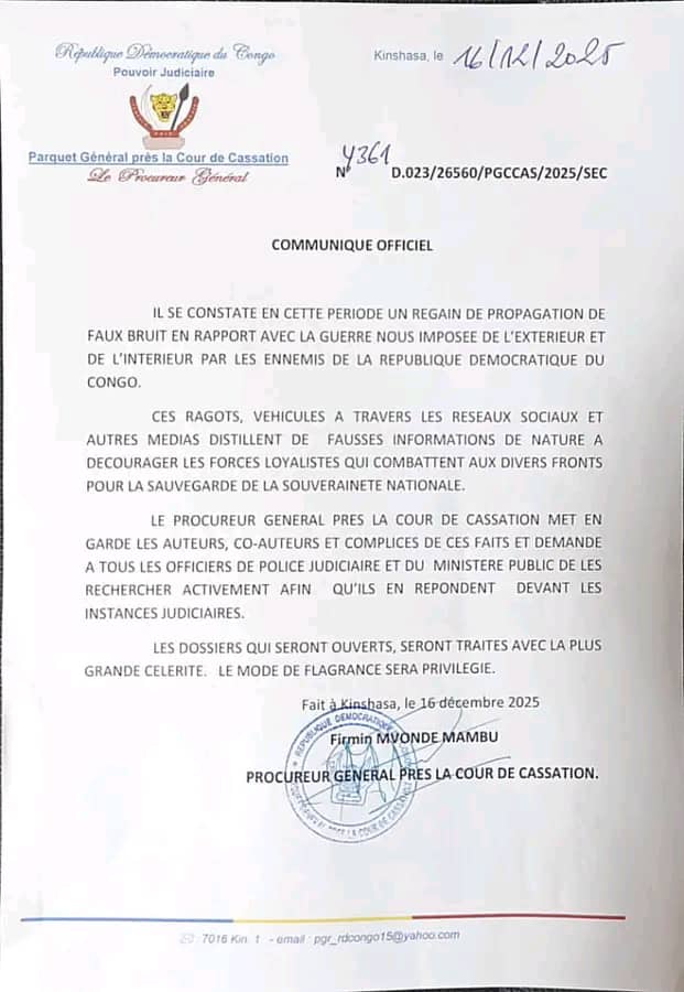 Dans un communiqué officiel, le Procureur général, Firmin Mvonde Mambu, dénonce la diffusion de rumeurs et de fausses nouvelles, notamment sur les réseaux sociaux et dans certains médias. Selon lui, ces actes visent à semer le doute et à démoraliser les forces armées engagées dans la défense de la souveraineté nationale.