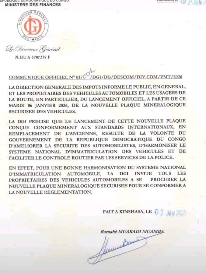 La Direction générale des impôts (DGI) via son Directeur général Barnabé Muakadi Muamba,a annoncé le lancement officiel d’une nouvelle plaque minéralogique sécurisée pour les véhicules en République démocratique du Congo.