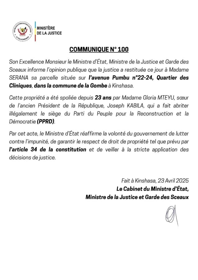 « La justice a restitué ce jour à Madame Serana sa parcelle située sur l’avenue Pumbu », peut-on lire dans le document signé par le ministre. Il rappelle également l’engagement du gouvernement à garantir le droit de propriété, conformément à l’article 34 de la Constitution congolaise.