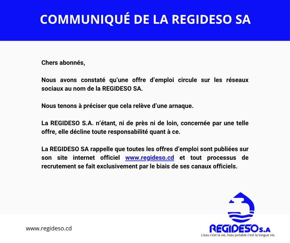 La société rappelle que toutes ses véritables offres d’emploi sont exclusivement publiées sur son site internet officiel www.regideso.cd, et que tout processus de recrutement passe uniquement par ses canaux de communication officiels.