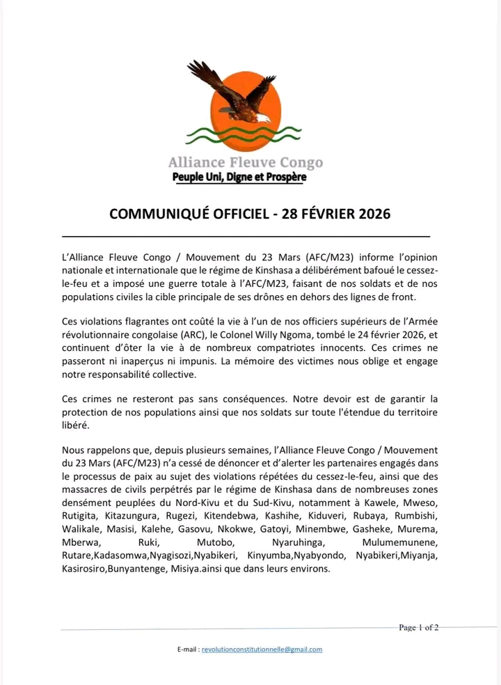 Dans un communiqué rendu public le 28 février 2026, l’AFC/M23 indique que l’officier est tombé le 24 février lors d’attaques de drones qui auraient visé ses positions dans le territoire de Rubaya, au Nord-Kivu. Le mouvement affirme que ces frappes constituent une violation « délibérée » du cessez-le-feu en vigueur.