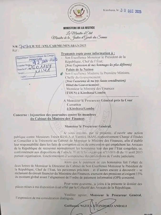 Le ministre d’État, ministre de la Justice et Garde des Sceaux, Guillaume Ngefa Ndondoko Andali, a officiellement instruit le Procureur général près la Cour de cassation d’engager des poursuites judiciaires contre deux membres du cabinet du ministre des Finances, cités dans une affaire présumée de corruption et de concussion.
