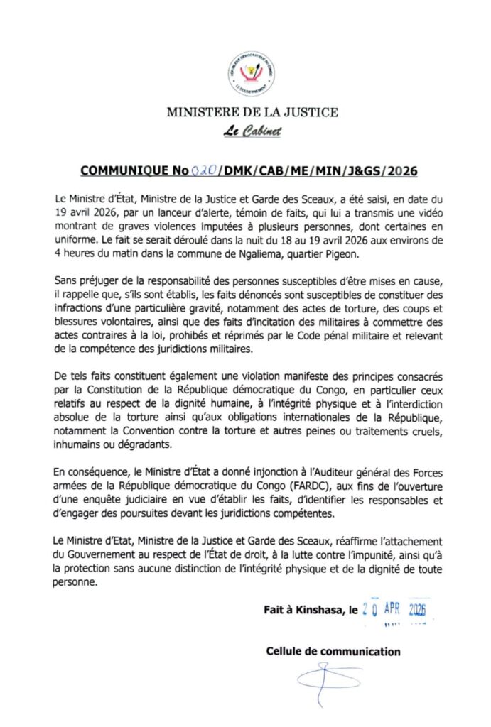 Selon ce communiqué daté du 20 avril 2026, le Ministre d’État en charge de la Justice et Garde des Sceaux a été saisi, le 19 avril, par un lanceur d’alerte ayant transmis une vidéo accablante.