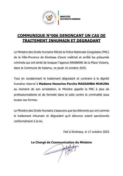 Cependant, le ministre a condamné avec fermeté le traitement jugé inhumain et dégradant infligé à Madame Honorine Porche Massamba Mukuna lors de son arrestation. Il a rappelé à la PNC la nécessité d’agir avec professionnalisme et respect des droits humains, même dans la lutte contre la criminalité.