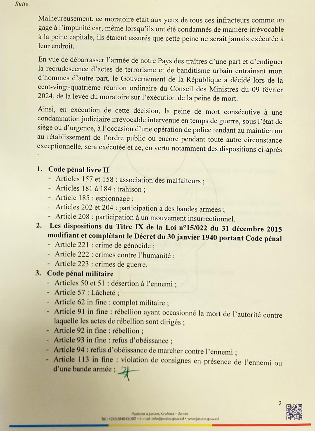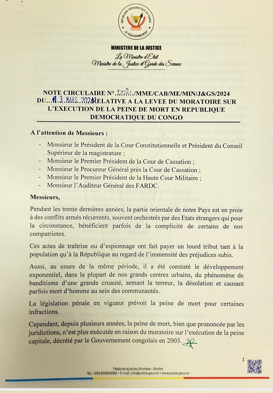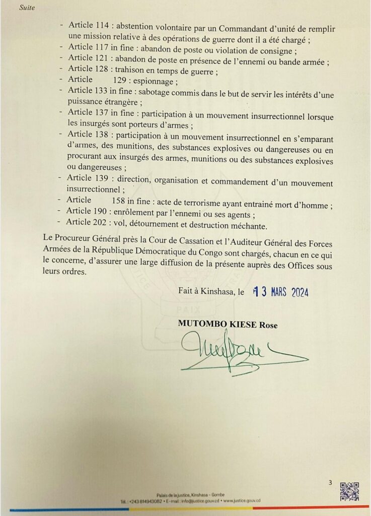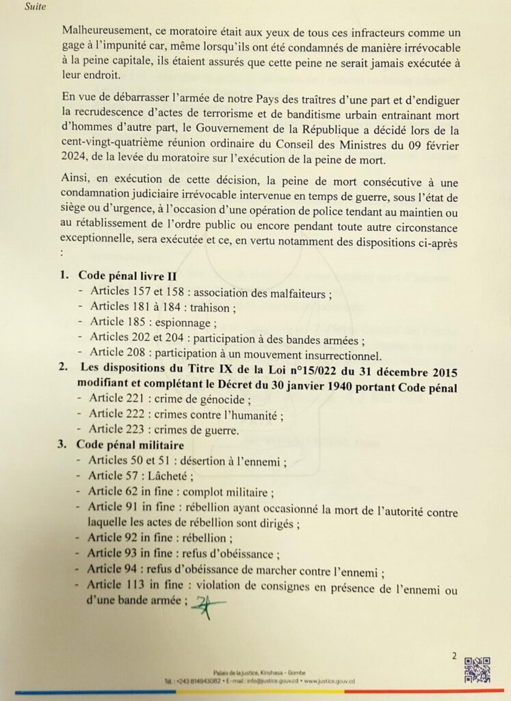 «La peine de mort consécutive à une condamnation judiciaire irrévocable intervenue en temps de guerre, sous état de siège ou d’urgence, à l’occasion d’une opération de police tendant au maintien ou au rétablissement de l’ordre public ou encore pendant toute autre circonstance exceptionnelle, sera (désormais) exécutée», a écrit la garde des sceaux, Rose Mutombo.