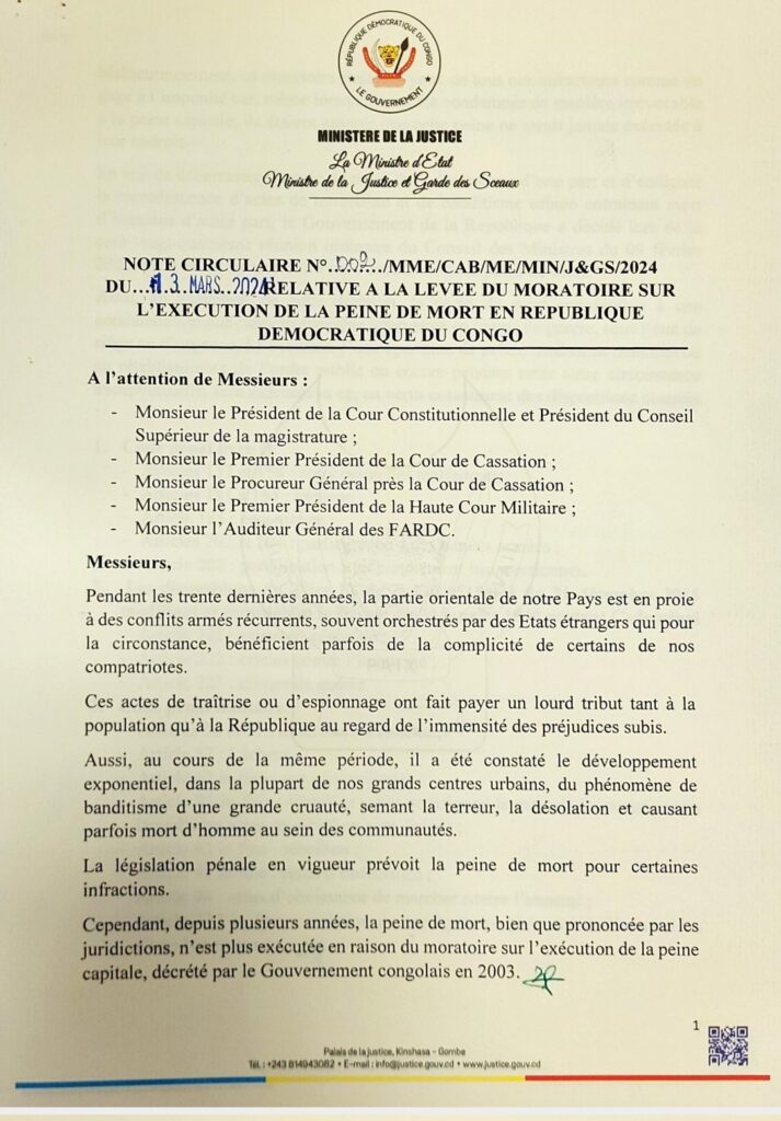 Le gouvernement de la République démocratique du Congo a levé le moratoire sur l’exécution de la peine de mort ce jeudi.