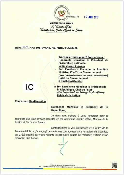 Dans sa lettre de démission adressée au Président de la République, Félix Tshisekedi, le mardi 17 juin, et rendue publique le mercredi 18 juin, l’ex-Ministre de la Justice, Constant Mutamba, affirme avoir été victime d’un « complot politique visiblement conçu à Kigali ».