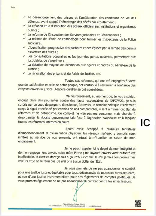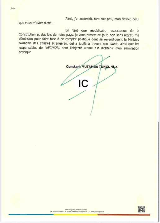 Dans sa lettre de délission, il évoque notamment la jubilation du ministre rwandais des Affaires étrangères et des responsables de l’AFC/M23 après sa mise à l’écart, y voyant la preuve d’un plan concerté pour l’écarter.