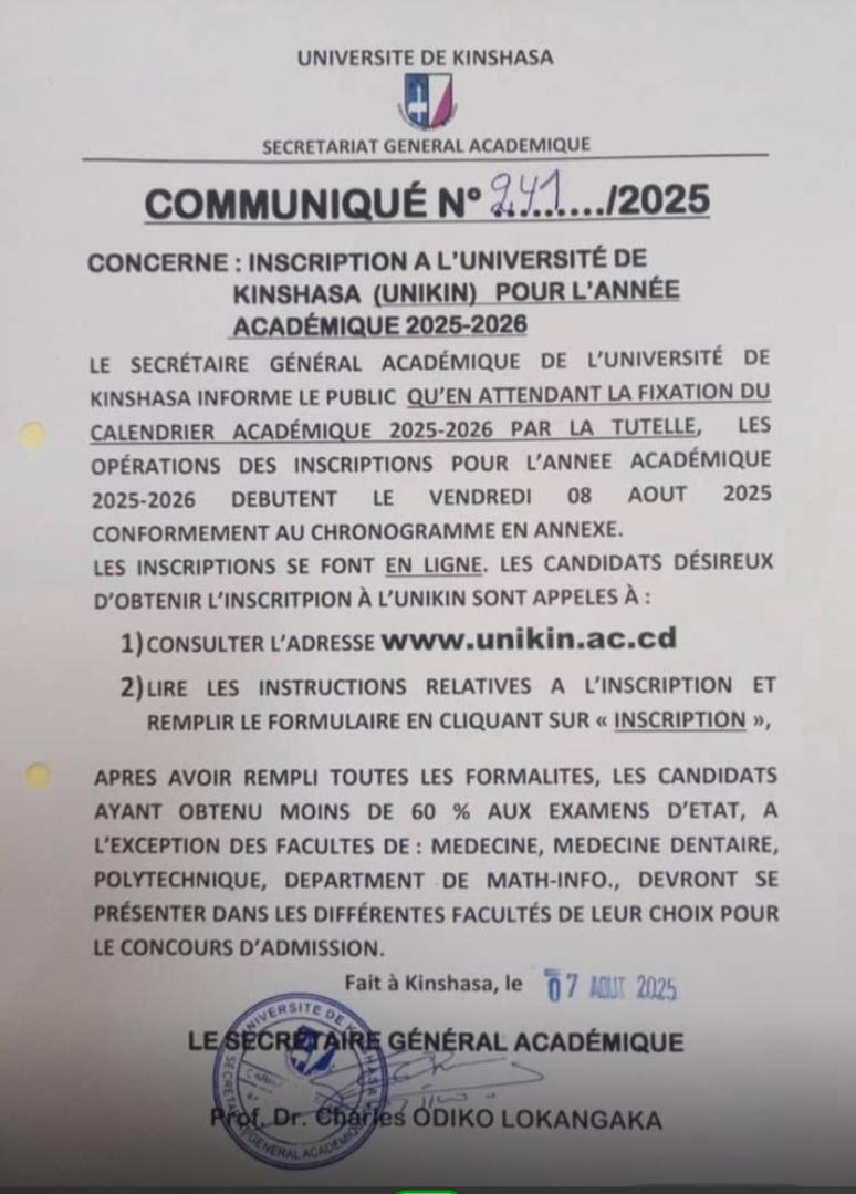 L’Université de Kinshasa (UNIKIN) a annoncé, dans un communiqué officiel rendu public le jeudi 7 août dernier par le Secrétaire général académique, le Professeur Dr Charles Odiko Lokangaka, le lancement des inscriptions pour l’année académique 2025-2026. Les opérations débuteront ce vendredi 8 août 2025, en attendant la publication du calendrier académique par la tutelle.
