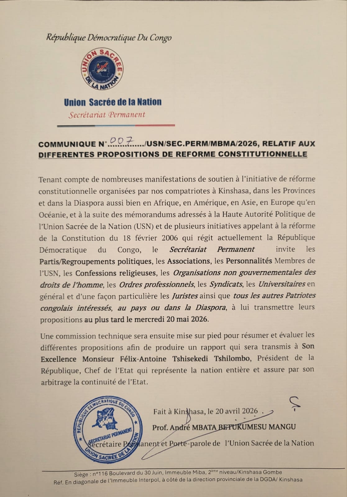 L’Union Sacrée de la Nation (USN) a officiellement lancé un appel à contributions dans le cadre des réflexions autour de la réforme de la Constitution du 18 février 2006 en République démocratique du Congo. À travers un communiqué signé le 20 avril 2026 à Kinshasa, consulté par la rédaction de Mai-ndombenews.net, son Secrétariat permanent invite les différentes composantes de la nation à soumettre leurs propositions en vue d’une éventuelle révision du texte fondamental.