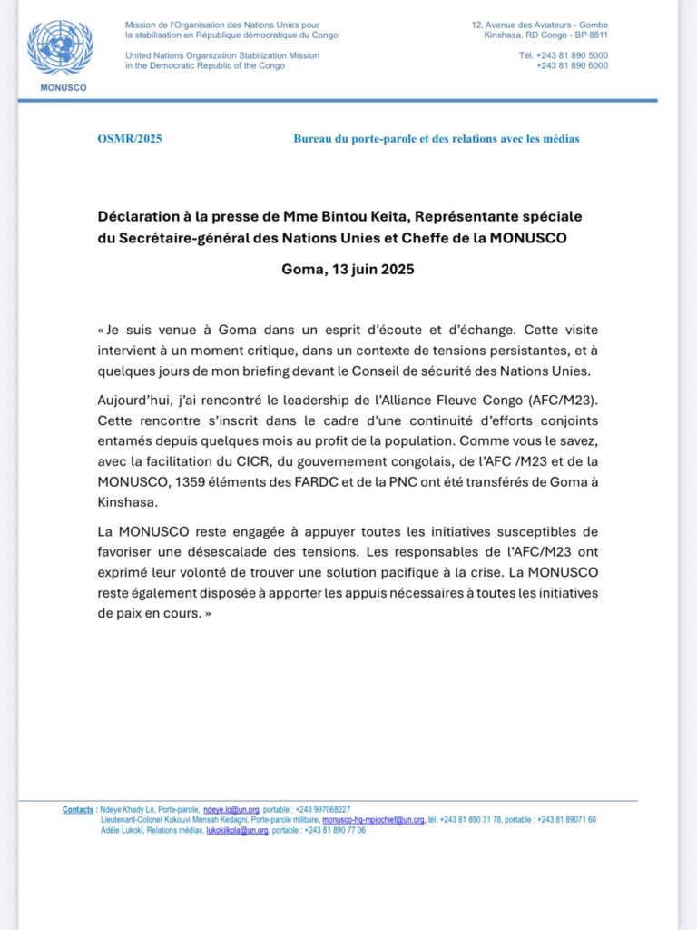 La cheffe de la Monusco, Bintou Keita a échangé avec les responsables de l’AFC/M23,le vendredi 13 juin à Goma,chef-lieu de la province du Nord-Kivu.