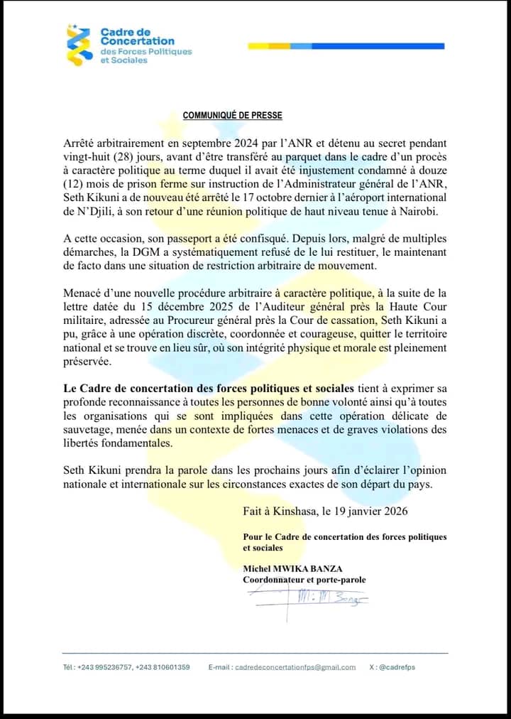 Le Cadre de concertation des forces politiques et sociales a annoncé, dans un communiqué publié le lundi 19 janvier 2026, que l’acteur politique congolais Seth Kikuni a quitté le territoire national pour des raisons de sécurité.