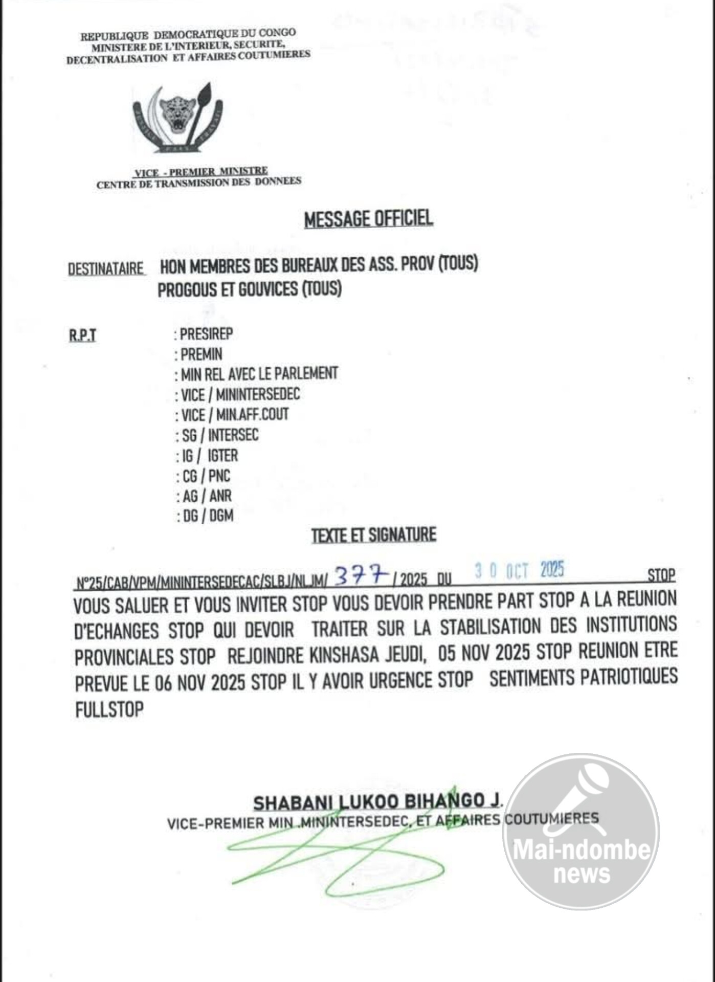 Dans ce message, ce membre du gouvernement les invite à prendre part à une réunion d’échanges cruciale axée sur la stabilisation des institutions provinciales. Cette rencontre est prévue le jeudi 5 novembre 2025 à Kinshasa, avec la tenue effective des travaux annoncée pour le 6 novembre.