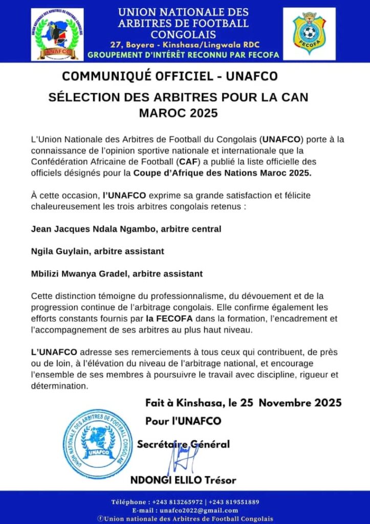 La CAN 2025 sera ainsi l’occasion pour ces officiels de confirmer leur statut et de renforcer davantage la réputation de l’arbitrage congolais, désormais bien installé parmi les meilleurs du continent.