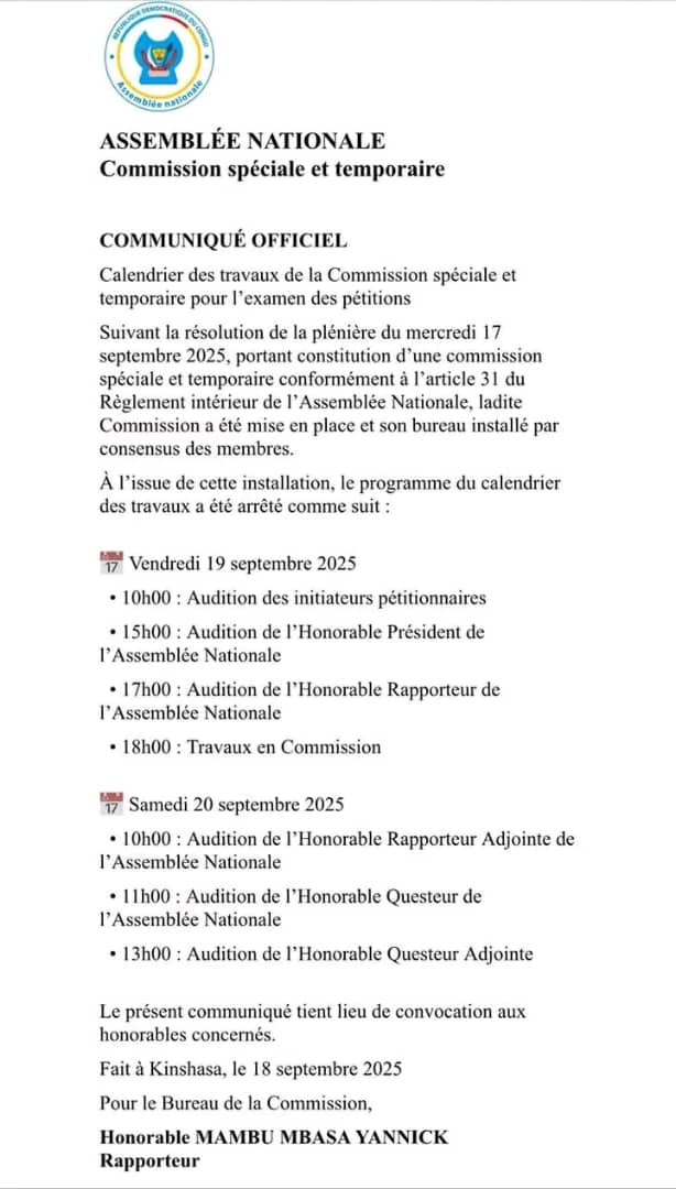 Selon un communiqué officiel consulté par la rédaction de Mai-ndombenews.net, cette audition s’inscrit dans le cadre dut calendrier arrêté par ladite commission à la suite de la plénière du 17 septembre dernier. Celle-ci a été chargée de traiter les pétitions introduites par plusieurs députés nationaux contre les membres du bureau, dont le président Vital Kamerhe.
