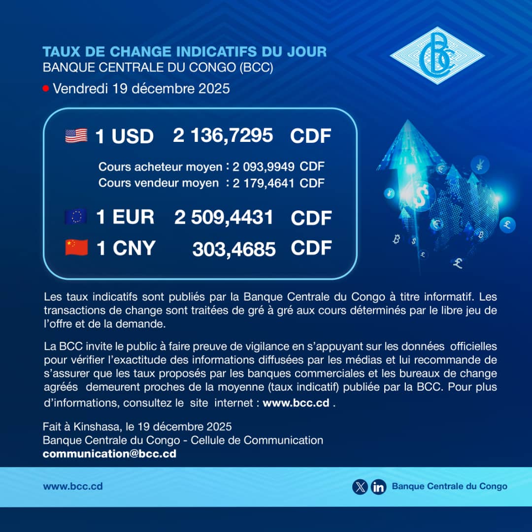 La Banque Centrale du Congo (BCC) a publié ce vendredi 19 décembre 2025, ses taux de change indicatifs, confirmant une relative stabilité du franc congolais face aux principales devises sur le marché officiel.