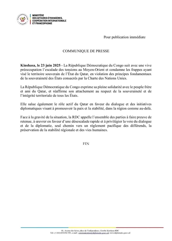 Dans une déclaration rendue publique le lundi 23 juin dernier, le gouvernement de la République Démocratique du Congo a fermement condamné les frappes ayant visé le territoire souverain de l’État du Qatar.